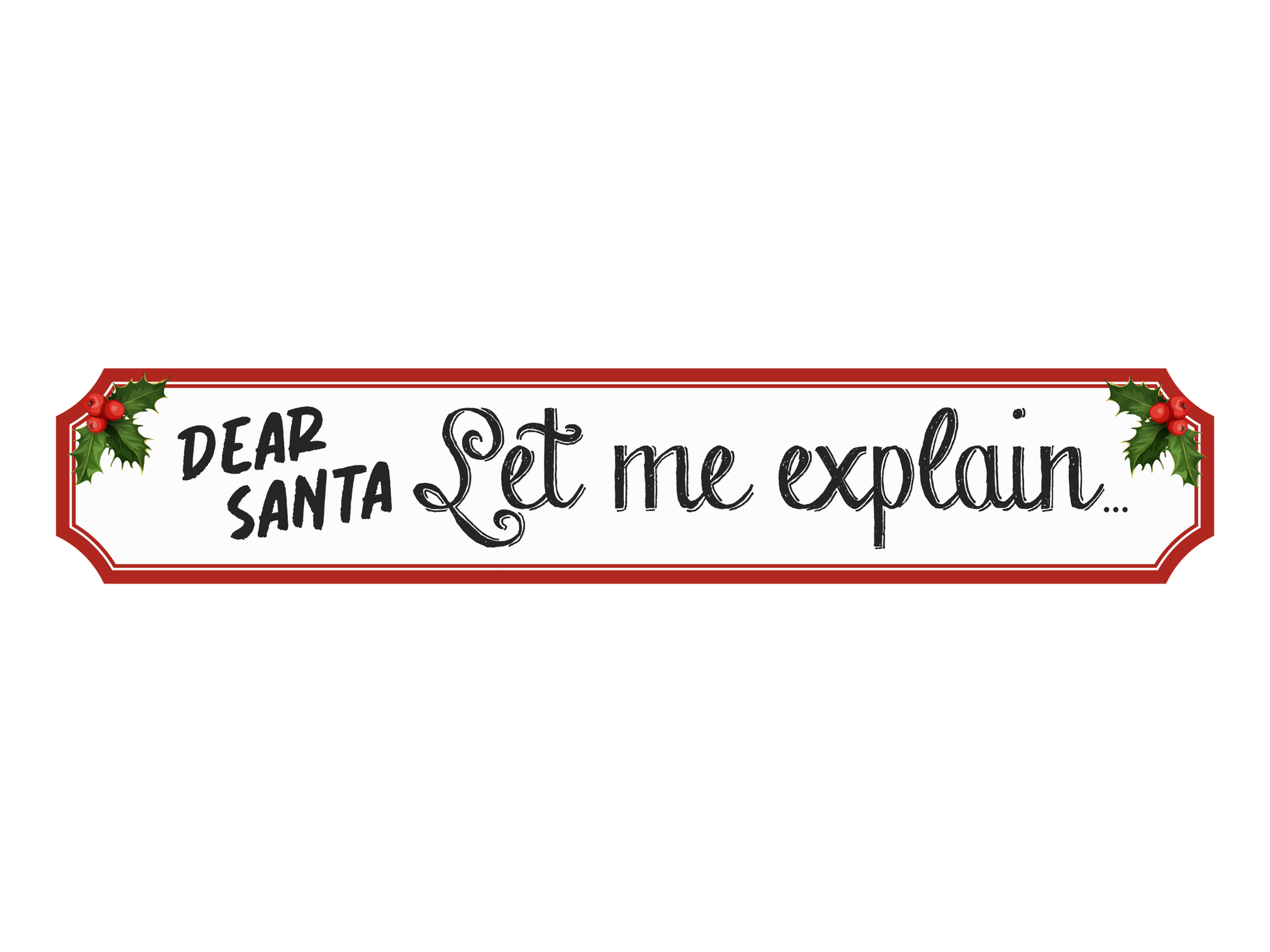 Bring a little extra magic into your home this christmas with this festive wooden sign, beautifully designed with the phrase "Dear Santa Let Me Explain". Featuring a cheery illustration of a couple of holly sprigs with a red border. Perfect for the mantel, kitchen or mounted on the wall to get your family in the christmas spirit.