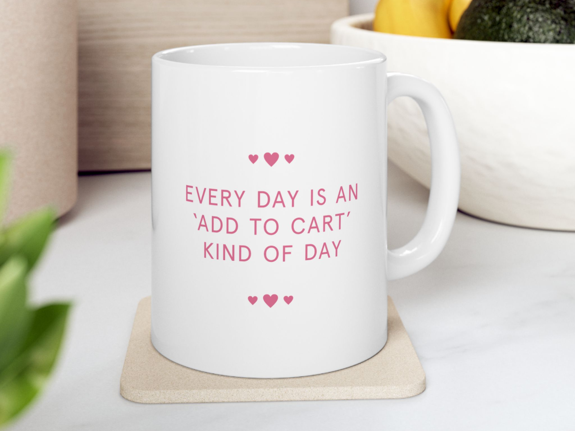 This fun pink mug proudly reads: “Every day is an Add to Cart kind of day.”
